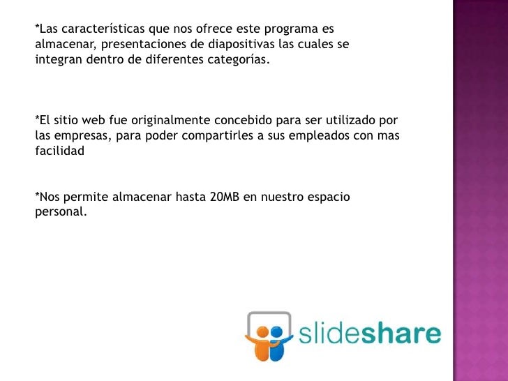 - 1. *Las características que nos ofrece este programa esalmacenar, presentaciones de diapositivas las cuales seintegran dentro de diferentes categorías.*El sitio web fue originalmente concebido para ser utilizado porlas empresas, para poder compartirles a sus empleados con masfacilidad*Nos permite almacenar hasta 20MB en nuestro espaciopersonal.