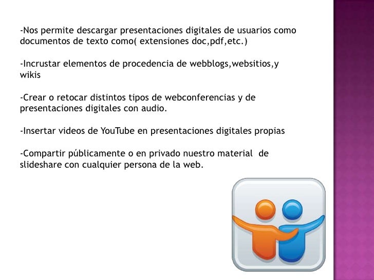 - 2. -Nos permite descargar presentaciones digitales de usuarios comodocumentos de texto como( extensiones doc,pdf,etc.)-Incrustar elementos de procedencia de webblogs,websitios,ywikis-Crear o retocar distintos tipos de webconferencias y depresentaciones digitales con audio.-Insertar videos de YouTube en presentaciones digitales propias-Compartir públicamente o en privado nuestro material deslideshare con cualquier persona de la web.