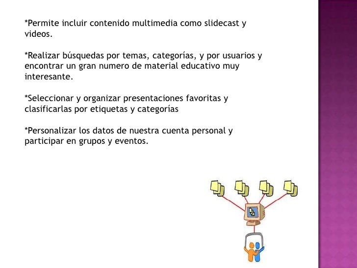 - 3. *Permite incluir contenido multimedia como slidecast yvideos.*Realizar búsquedas por temas, categorías, y por usuarios yencontrar un gran numero de material educativo muyinteresante.*Seleccionar y organizar presentaciones favoritas yclasificarlas por etiquetas y categorías*Personalizar los datos de nuestra cuenta personal yparticipar en grupos y eventos.